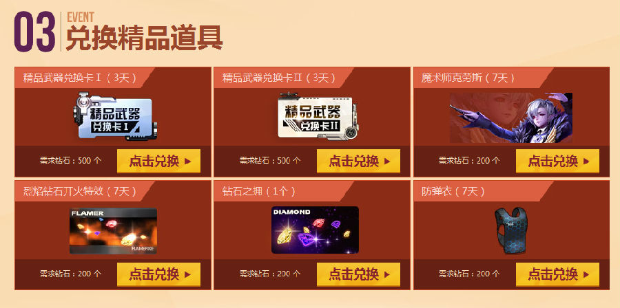 2、活动期间,玩家可以使用一定数量的枪神之钻来兑换奖励,每种奖励每个QQ号最多只能兑换5次;非卖品每日限量兑换,每个限量道具每人每天只能兑换1次;