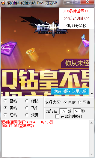 枪神纪定时抢六钻工具是一款枪神纪活动辅助工具,枪神纪于7月18日开启了全民不限号公测,参加QQ钻皇不是梦活动,通过玩游戏击杀怪物获得钻石,使用钻石就可以兑换QQ六钻,QQ钻皇从此不是梦,只要你来玩就送!只要你的钻石足够,就可以使用本工具进行挂机定时抢换QQ六钻!