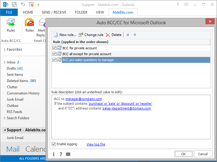 在创建规则投入了几分钟的时间,从现在开始,你将永远不会忘记一个CC或BCC地址添加到您的发送电子邮件。你根本不会记得它 - 这个插件的Outlook会为你做及时,准确,无误。自动副本将被发送的所有发送的邮件是否是一个新的电子邮件,回复或转发信件。展望2010年,2007年,2003年以及2013 32位和64位:所有Microsoft Office主要版本由自动BCC支持。